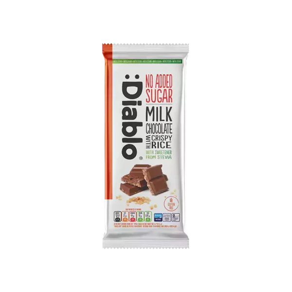Sweeteners (maltitol and steviol glycosides (0.02%)), cocoa butter, whole milk powder, extruded rice (rice flour, maize flour, salt )(12%), cocoa paste, butter, emulsifier (soya lecithin) and flavoring. Cocoa: 30% minimum. Contains naturally occurring sugars. Gluten Free. Excessive consumption may produce laxative effects. For allergens, see ingredients in bold. May contain other nuts.